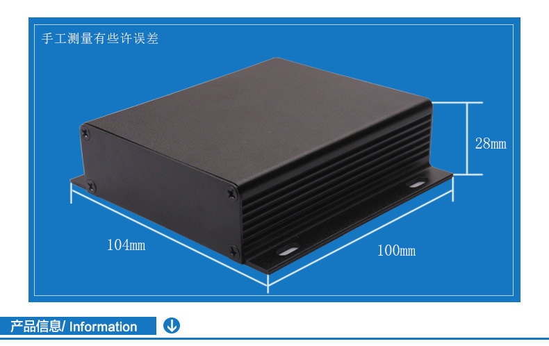名稱:鋁型材外殼 表面:黑色噴砂氧化 尺寸:104*100*28mm 標品圖號:GEM-Z032-GEM03A 特點:1.全鋁材質,黑色表面,堅固耐用,卡槽固定,針對PCB板做外殼保護。 ? ? ? ? ?2.上下蓋結構,安裝拆卸方便,易操作??捎糜陔娫春小⒖刂破魍鈿?、小機箱外殼等。