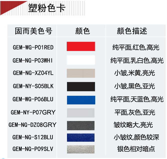 七、外殼表面顏色,以下是我們備有庫存的噴粉顏色,請選擇【GEM-NY-S05BLK】,如果要其他指定顏色,請注明勞爾色號或者潘通色號__________,需要延長周期和成本。