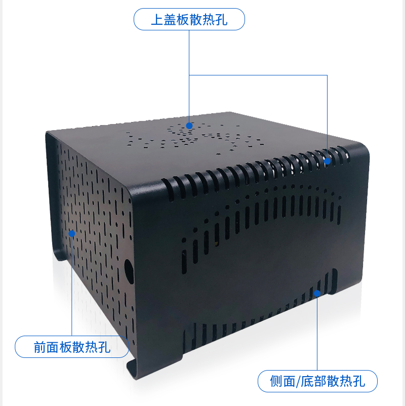 首先在我們itx機箱的基礎上升級而來的itx02機箱,此款機箱與之不同的點在于機箱的上蓋由鍍鋅板改為了鋁制。整體數據變為下殼采用1.0mm的鍍鋅板,上蓋為2.0mm的鋁合金、重量為1.6kg、體積202.2*217*84.7mm,維持了原產品的小巧精致。此外為了能夠有更好的散熱性能,ITX02對原產品的散熱孔進行了更改,主要增加了孔徑和孔數。ITX02仍舊采用抽插式外殼簡便安裝,但升級了內部襯板的安裝方式,改為卡扣式增加了內部穩定性的同時,又方便了安裝和取出,同時布置了內部理線孔,使得線控布局更加合理。CPU散熱方面支持高度為50mm以下的散熱器,而受制于體積的原因此款機箱并不支持獨立顯卡。