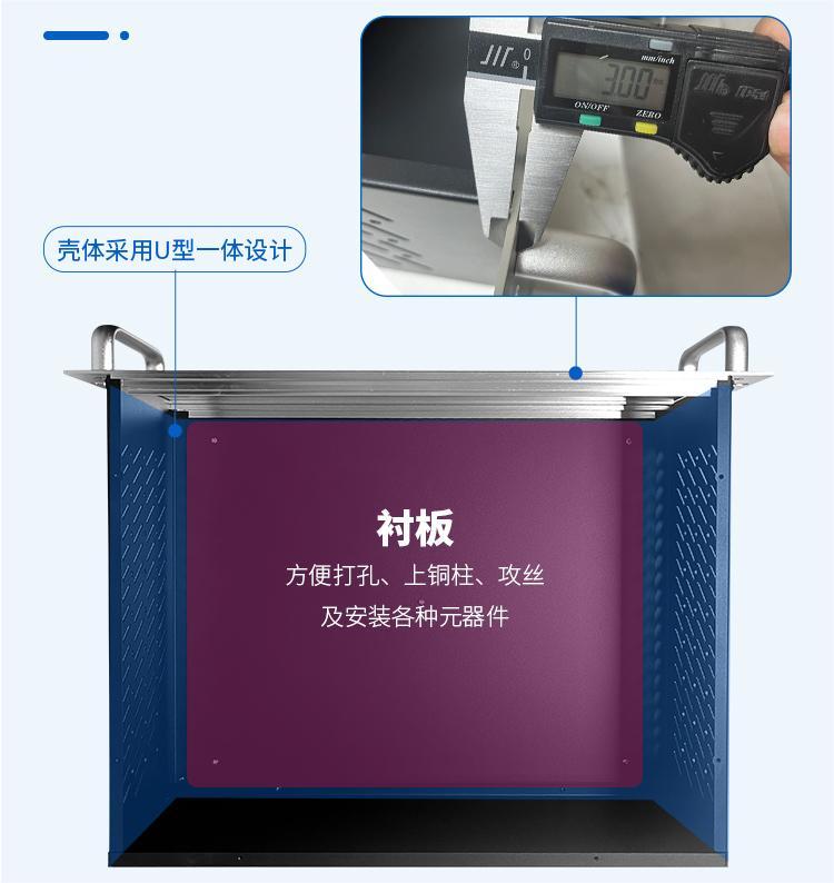 3、設計的整體性:一體化U型設計,結構更穩固,鋁型材前面板+鋁把手,襯板方便打孔、上銅柱、攻絲以及安裝各種元器件。